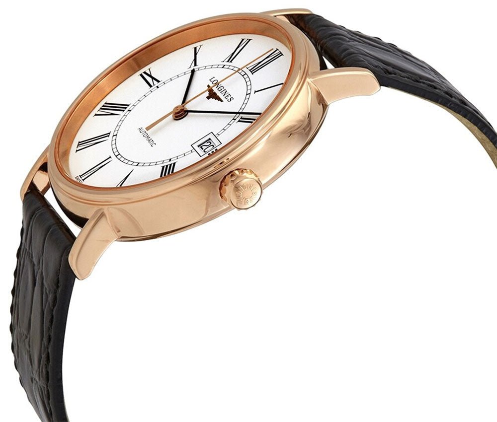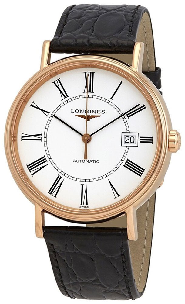 Longines Presence Automatic Rose Gold PVD White Dial Black Leather Strap Date Mens Watch L4.922.1.11.2