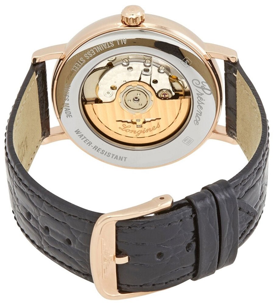 Longines Presence Automatic Rose Gold PVD White Dial Black Leather Strap Date Mens Watch Model# L4.922.1.11.2 / L49221112