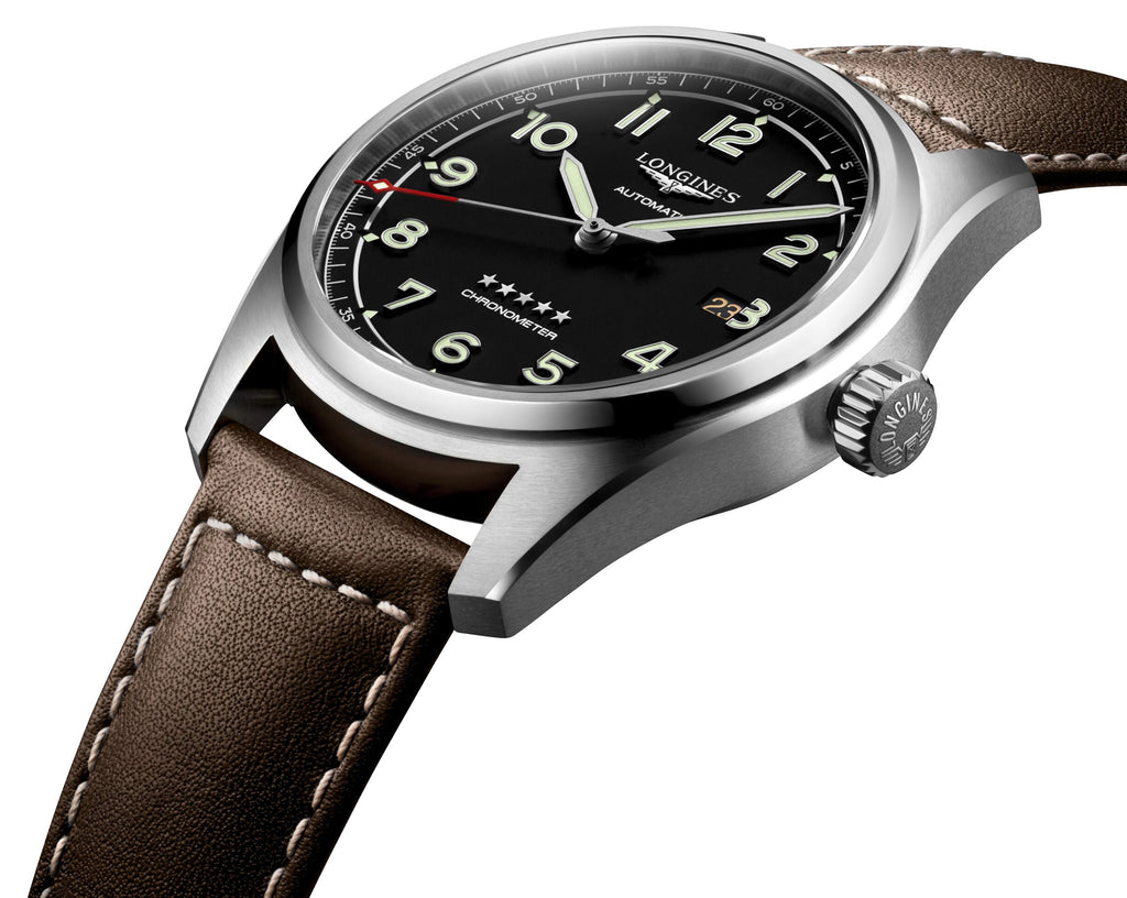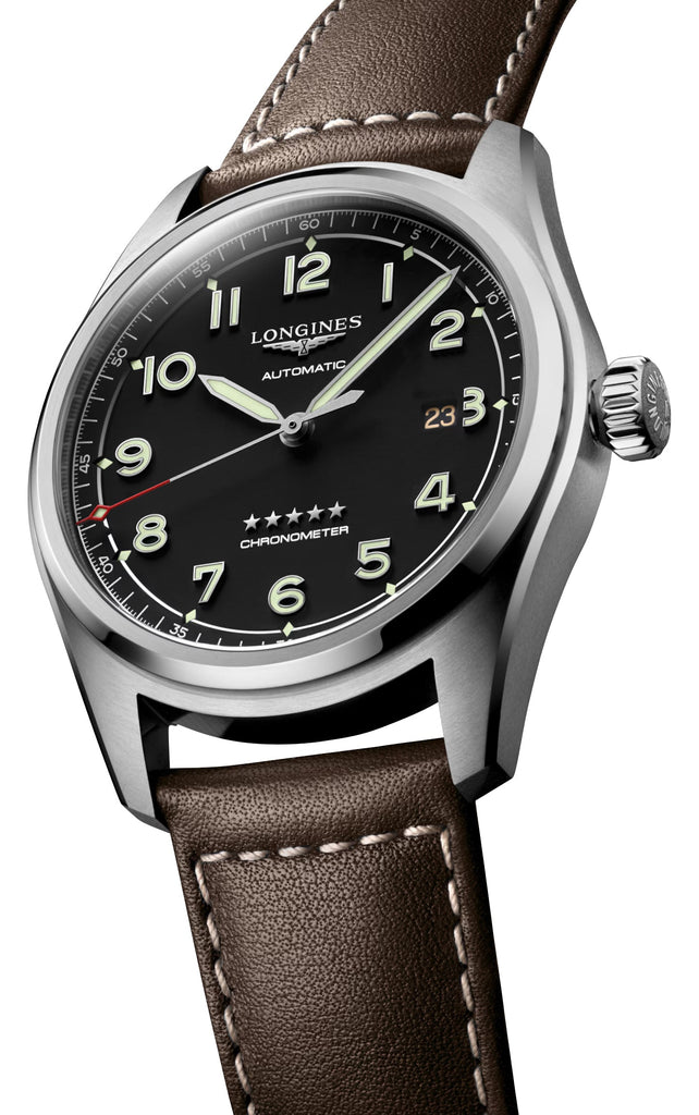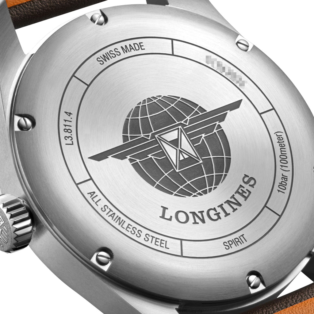 Accompanying some of the world's greatest explorers in their conquest of the air, sea, and land for nearly a century, the Longines Spirit collection brings to life the pioneering spirit that drove these extraordinary men and women to surpass themselves, pursue new ambitions, and believe in the impossible. This Longines Spirit Chronometer features a 42 mm stainless steel case that holds a matte black dial under a scratch-resistant sapphire crystal. It also has silver-tone and luminescent pencil hands with applied Arabic numerals as hour markers. A polished silver-tone ring separates the main dial from the outer minute track where diamond-shaped luminescent markers are laid out every 5-minute intervals, lining up with the red and diamond-shaped tip of the revolving second hand. Complementing this chronometer are distinctive silver-tone winged and 5-star emblems, white dial texts, a discreet date window at the 3 o'clock position, and an oversized screw-down crown. It is It is fitted with a brown leather strap and secured by a stainless steel signed buckle. The solid case-back is decorated with Longines' winged hourglass over a globe meridian background. Encased within is the caliber L888.4, a COSC-certified Swiss automatic chronometer movement beating at 25,200 vibrations per hour generating up to 72 hours of power reserve, and is water-resistant up to 100 meters/300 feet.
