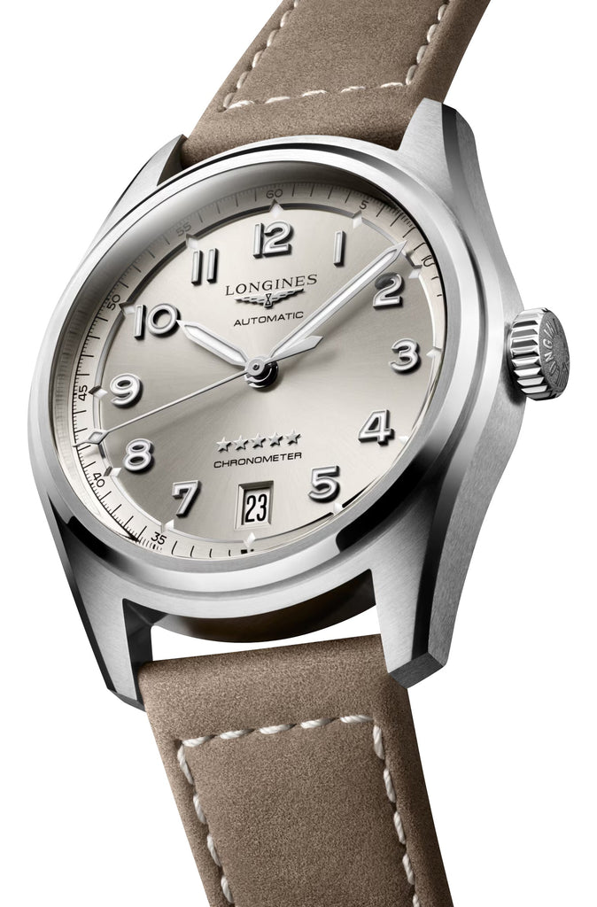 Accompanying some of the world's greatest explorers in their conquest of the air, sea, and land for nearly a century, the Longines Spirit collection brings to life the pioneering spirit that drove these extraordinary men and women to surpass themselves, pursue new ambitions, and believe in the impossible. This ladies' Longines Spirit Chronometer features a 37 mm stainless steel case that holds a champagne dial under a scratch-resistant sapphire crystal. It also has gray PVD-coated and luminescent pencil hands with applied Arabic numerals as hour markers. A polished silver-tone ring separates the main dial from the outer minute track where diamond-shaped luminescent markers are laid out every 5-minute intervals, lining up with the diamond-shaped tip of the revolving second hand. Complementing this chronometer are distinctive silver-tone winged and 5-star emblems, black dial texts, a discreet date window at the 6 o'clock position, and a screw-down crown. It is fitted with a beige leather strap and secured by a stainless steel signed buckle. The solid caseback is decorated with Longines' winged hourglass over a globe meridian background. Encased within is the caliber L888.4, a COSC-certified Swiss automatic chronometer movement beating at 25,200 vibrations per hour generating up to 72 hours of power reserve, and is water-resistant up to 100 meters/300 feet.