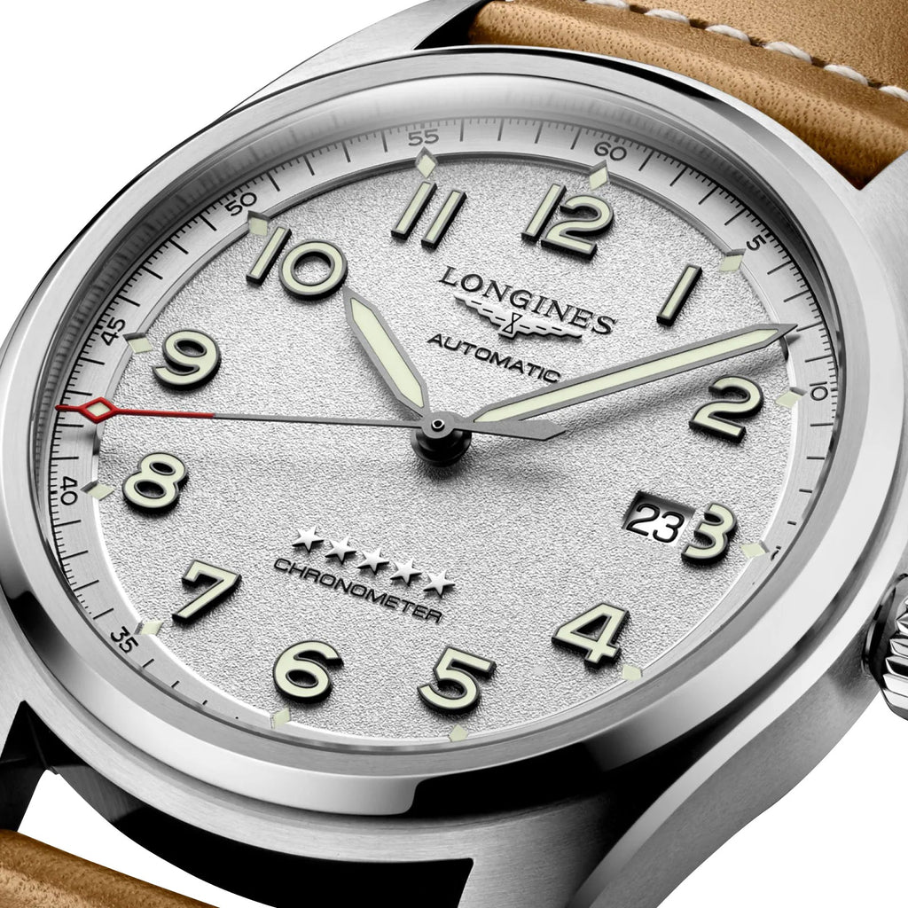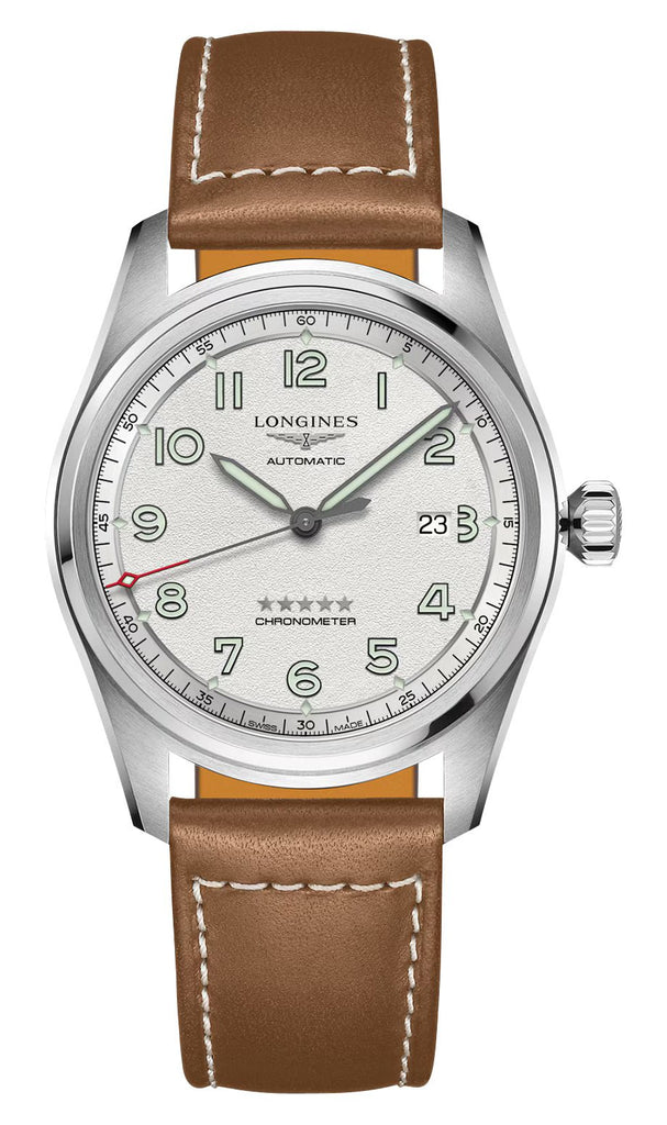 A collection with an impeccable pedigree, the Longines Spirit was created by the winged hourglass brand, drawing inspiration from its heritage of going hand in hand with legendary pioneers who conquered air, land, and sea. This Longines Spirit Chronometer features a 42 mm stainless steel case that holds a textured silver-tone dial under a scratch-resistant sapphire crystal. It also has gray and luminescent pencil hands with applied Arabic numerals as hour markers. A polished silver-tone ring separates the main dial from the outer minute track, where diamond-shaped luminescent markers are laid out every 5-minute intervals, lining up with the red and diamond-shaped tip of the revolving second hand. Complementing this chronometer are silver-tone winged & 5-star emblems, black dial texts, raised chapter ring, discreet date window, and an oversized screw-down crown. It is fitted with a brown leather strap and secured by a stainless steel signed buckle. The solid caseback is decorated with Longines' winged hourglass over a globe meridian background. Encased within is the caliber L888.4, a COSC-certified Swiss automatic chronometer movement beating at 25,200 vibrations per hour generating up to 72 hours of power reserve, and is water-resistant up to 100 meters/300 feet.