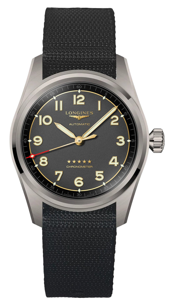 A collection with an impeccable pedigree, the Longines Spirit was created by the winged hourglass brand, drawing inspiration from its heritage of going hand in hand with legendary pioneers who conquered air, land, and sea. This Longines Spirit Chronometer features a 40 mm titanium case that holds a matte anthracite gray dial under a scratch-resistant sapphire crystal. It has gold-tone and luminescent pencil hands with applied Arabic numerals as hour markers. A polished gold-tone ring separates the main dial from the outer minute track, where diamond-shaped luminescent markers are laid out every 5-minute intervals, lining up with the red and diamond-shaped tip of the revolving second hand. Complementing this time-only chronometer are gold-tone winged & 5-star emblems and dial texts, a raised black chapter ring, and an oversized screw-down crown. It is fitted with a black nylon strap and secured by a stainless steel signed buckle. The solid caseback is decorated with Longines' winged hourglass over a globe meridian background. Encased within is the caliber L888.4, a COSC-certified Swiss automatic chronometer movement beating at 25,200 vibrations per hour generating up to 72 hours of power reserve, and is water-resistant up to 100 meters/300 feet.