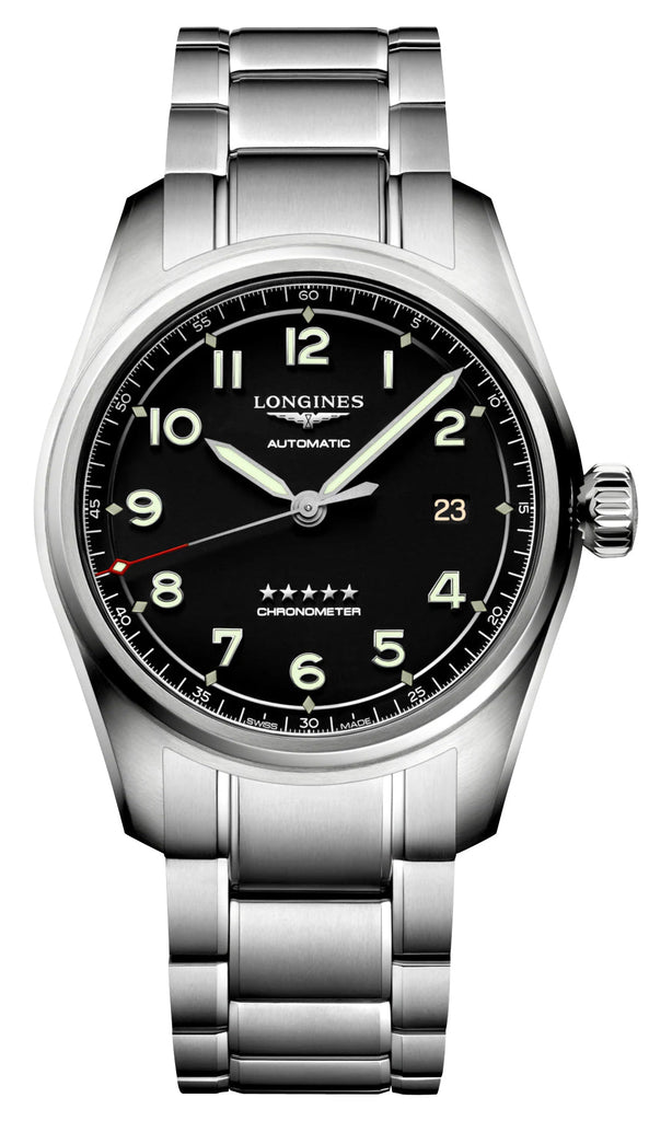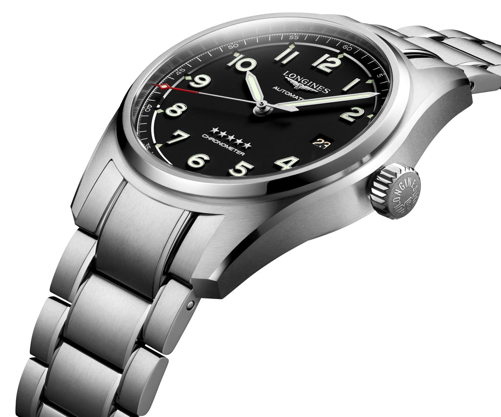 Accompanying some of the world's greatest explorers in their conquest of the air, sea, and land for nearly a century, the Longines Spirit collection brings to life the pioneering spirit that drove these extraordinary men and women to surpass themselves, pursue new ambitions, and believe in the impossible. This Longines Spirit COSC Prestige Edition features a 40 mm stainless steel case that holds a black dial under a scratch-resistant sapphire crystal. It also has silver-tone and luminescent pencil hands with applied Arabic numerals as hour markers. A polished silver-tone ring separates the main dial from the outer minute track where diamond-shaped luminescent markers are laid out every 5-minute intervals, lining up with the red and diamond-shaped tip of the revolving second hand. Complementing this chronometer are distinctive silver-tone winged and 5-star emblems, white dial texts, a discreet date window at the 3 o'clock position, and an oversized screw-down crown. It is fitted with a stainless steel bracelet and secured by a double safety folding clasp and push-piece opening mechanism. This Prestige Edition includes two interchangeable brown leather straps (1 conventional / 1 NATO) and is packaged in an exclusive box adorning the series logo. The solid caseback is decorated with Longines' winged hourglass over a globe meridian background. Encased within is the caliber L888.4, a COSC-certified Swiss automatic chronometer movement beating at 25,200 vibrations per hour generating up to 72 hours of power reserve and is water-resistant up to 100 meters/300 feet.