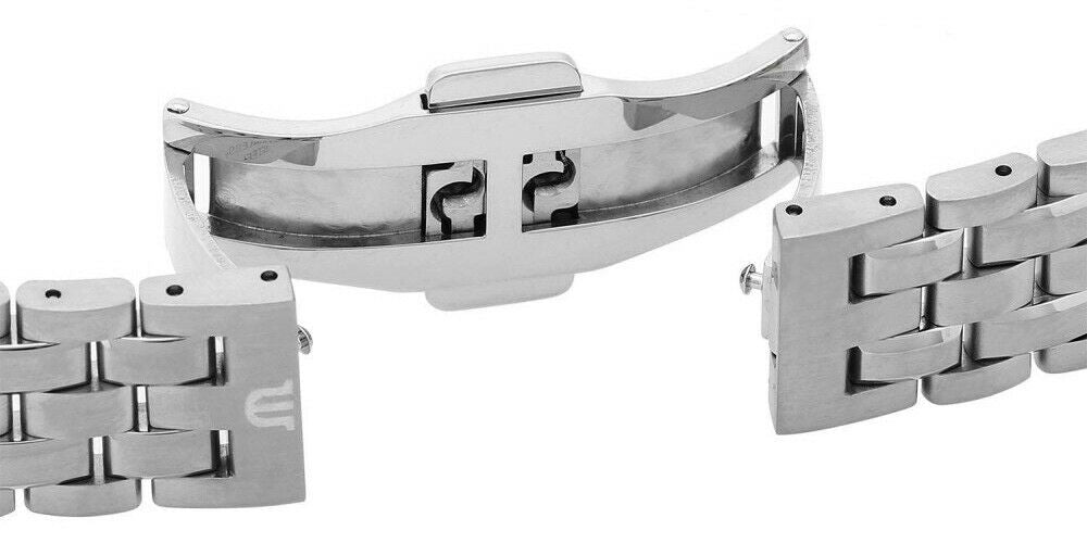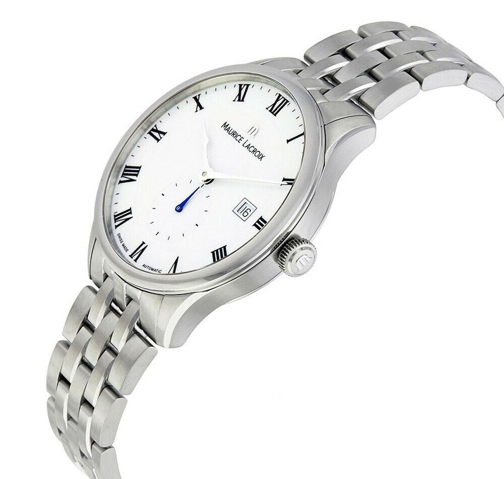 Maurice Lacroix Masterpiece Small Second Automatic Stainless Steel Mens Watch Model # MP6907-SS002-112-1 , MP6907SS002112 is sure to impress with its elegant, modern and charming design! This Swiss watch is presented in a brushed & polished stainless steel case and bracelet, push button deployment clasp, White dial, silver tone hand indicators & black Roman Numeral hour markers, Seconds sub-dial at the 6 o'clock position, Date display at the 3 o'clock position, a Superior Anti-reflective Scratch Resistant Sapphire Crystal protects the dial, Push/pull crown with Maurice Lacroix logo, Screw-in transparent case back, Swiss Automatic movement, Caliber ML 158, beats at 28,800 vph, 26 Jewels, 38 Hour Power Reserve. Water resistant to 5 ATM/50 meters/165 feet.As all of our watches, this Maurice Lacroix Masterpiece Small Second Gents watch is BRAND NEW, and comes in its original packaging.