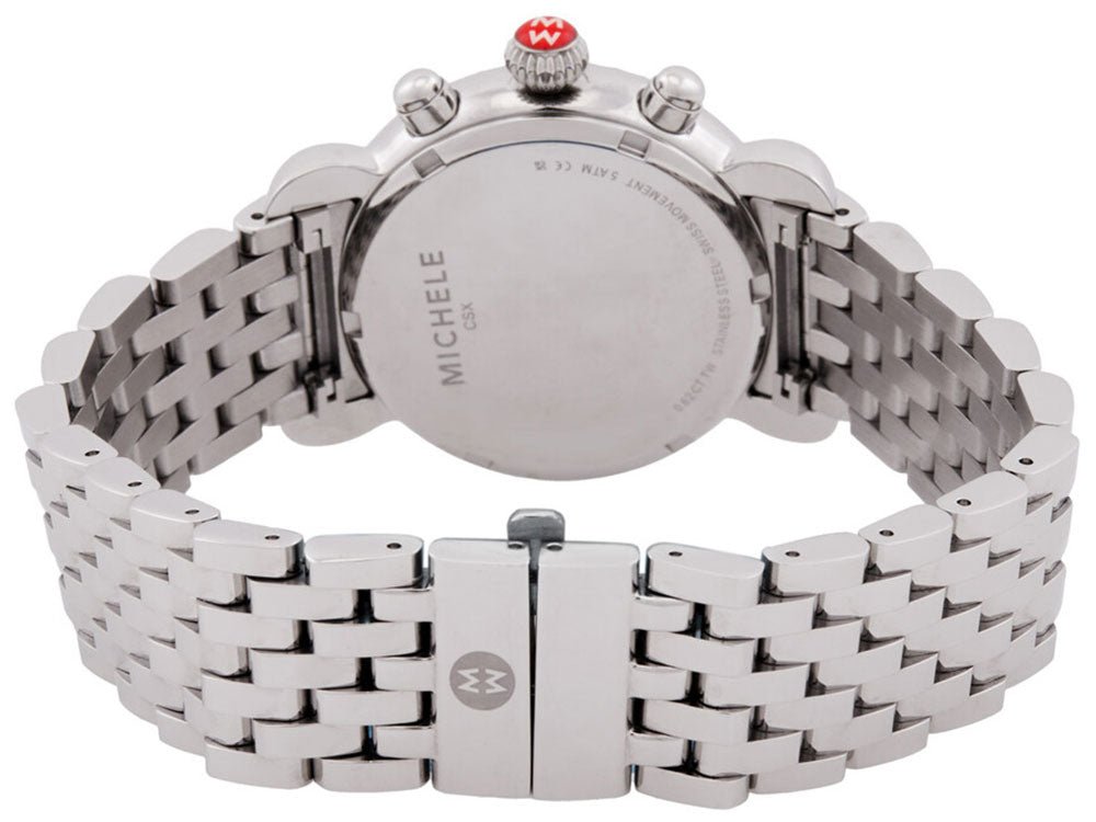 The watch case and bracelet are crafted from polished stainless steel, Mother of pearl dial, Silver-tone and luminous hand indicators, Date display at the 6 o'clock position, Chronograph Functions: 60 seconds, 30 minutes and 12 hours, 107 dazzling diamonds (0.62 ct), Scratch-resistant sapphire crystal, Crown is set with red enamel Michele logo, Swiss quartz chronograph movement, Water resistant to 50 meters/165 feet.