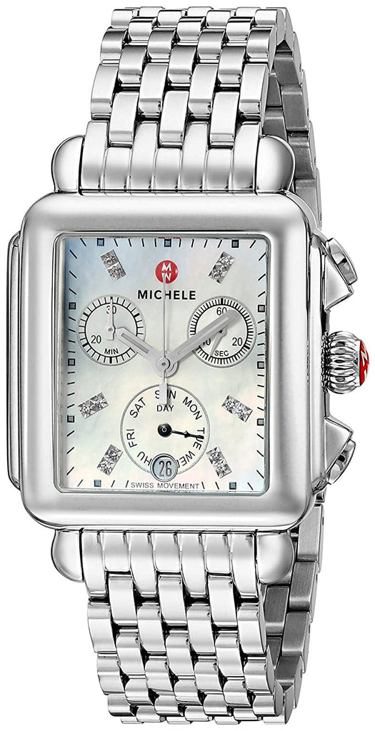 Michele Deco Chronograph Stainless Steel Diamonds Womens Swiss Luxury Watch Model# MWW06P000014. The watch case & bracelet are crafted from polished stainless steel, white mother-of-pearl dial set with 12 Diamonds hour markers, silver tone & luminous hand indicators, Date display at the 6 o'clock position, Chronograph functions: Small seconds counter located at the 2 o'clock, 30 minute counter located at the 10 o'clock, Day of week in sub-dial at the 6 o'clock position, Scratch Resistant Sapphire Crystal, Crown is set with red enamel Michele logo, Swiss Quartz Chronograph movement, Water resistant to 50 meters/165 feet.As all of our watches, this Michele Deco Stainless Steel Ladies watch is BRAND NEW and comes in its original packaging with the warranty card and papers.