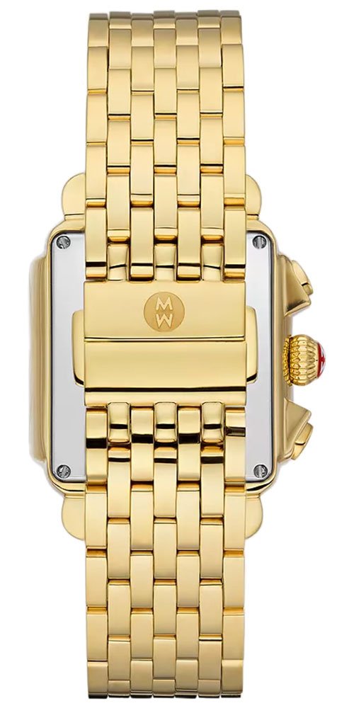 The watch case & bracelet are crafted from polished 18K yellow gold plated stainless steel, 108 dazzling diamonds set on the bezel (0.60 ct), gold mirror dial, gold tone & luminous hand indicators, 12 diamond hour markers (0.05 ct), Date display at the 6 o'clock position, Chronograph functions: 1/10 Second, 60 Seconds and 30 Minutes, Scratch resistant sapphire crystal, Crown is set with red enamel Michele logo, Swiss quartz movement, Water resistant to 50 meters/165 feet.