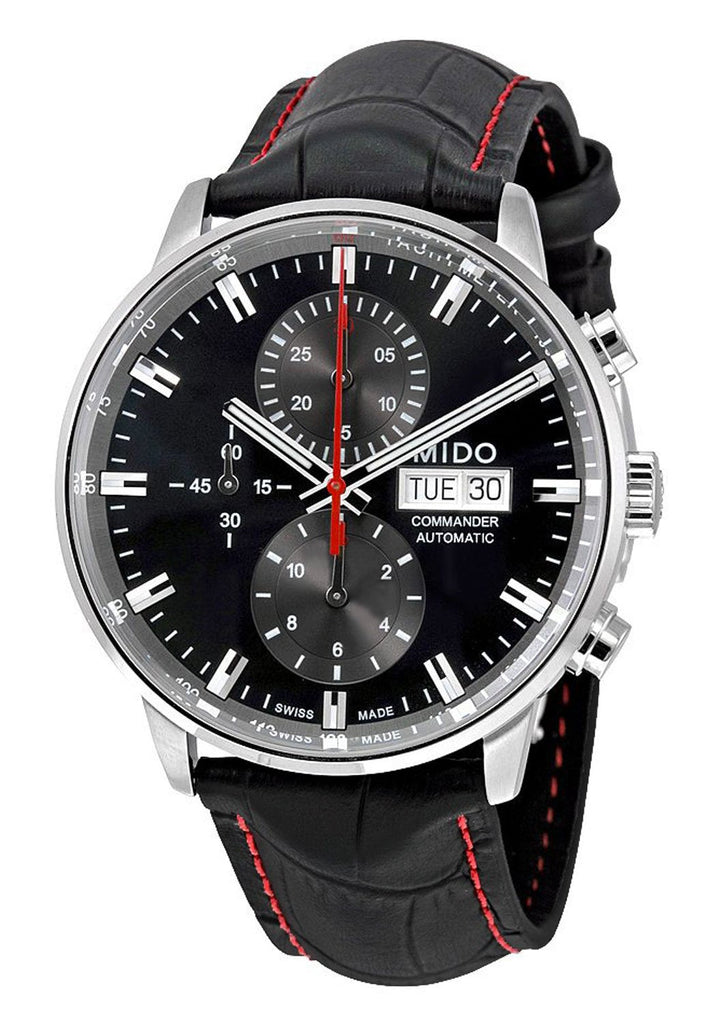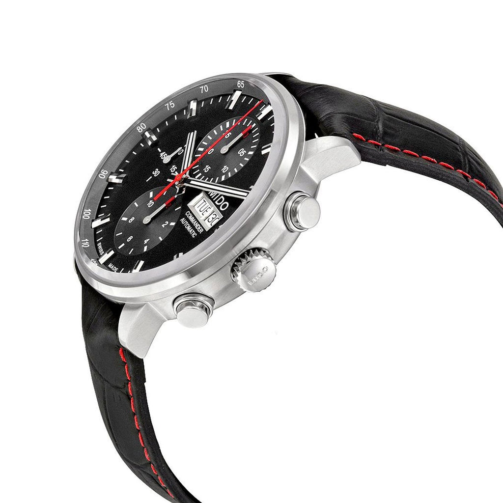 Mido Commander II Automatic Chronograph Black Dial Day/Date Mens Strap Watch Model# M016.414.16.051.00 / M0164141605100 features a brushed & polished stainless steel case that holds the black dial. The dial has silver-tone/black and luminous hands, silver tone & luminous index hour markers, chronograph functions; 30 minutes, 12 hours, & 60 seconds, a day of week & date display window at the three o'clock position and the case back is transparent. The black genuine leather band has red stitching and a deployment clasp. This watch runs on a Swiss automatic chronograph movement and is water-resistant up to 50 meters/165 feet.Like all of our watches, this Mido Commander II Automatic Chronograph Stainless Steel Black Dial Date Mens Watch is brand new and comes in its original packaging.