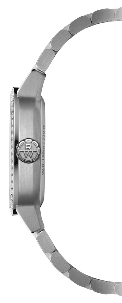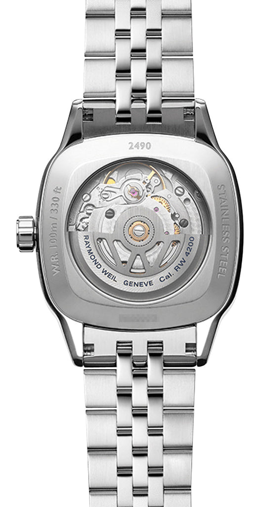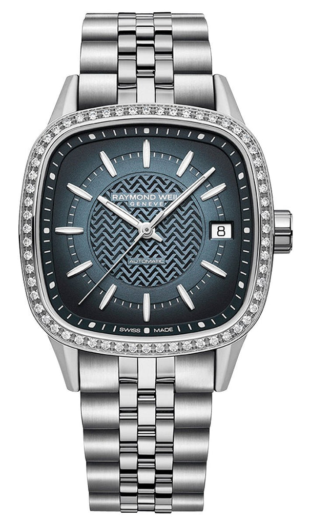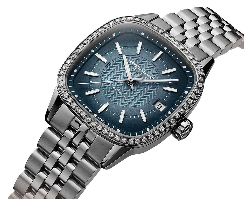Created in honor of the free-spirited man combining classic and modest to create a harmonious and unique design. A new interpretation of the form watch that elegantly transcends convention, this ladies' Freelancer is the next evolution of its automatic collection. It features a 34.5 x 34.5 mm stainless steel cushion-shaped square case with a fixed diamond-set bezel embellished with 60 sparkling diamonds totaling 0.399 carats. It holds a mesmerizing gradient blue dial under a scratch-resistant sapphire crystal, its signature 'W' guilloche is a nod to the Raymond Weil brand, and captivates the lighter-colored center with subtle shades, gradually turning to an almost black outer section. It has silver-tone and luminescent barrel hands and applied indices as hour markers, which are laid out along the recessed inner railway minute track. A beveled date aperture sits at the 3 o'clock position adjacent to the fluted crown. It is fitted with a stainless steel bracelet and secured by a folding clasp with double push-security system. This watch has an exhibition caseback showcasing the caliber RW4200, a Swiss automatic movement beating at 28,800 vibrations per hour, generating up to 41 hours of power reserve and is water-resistant up to 100 meters/330 feet.