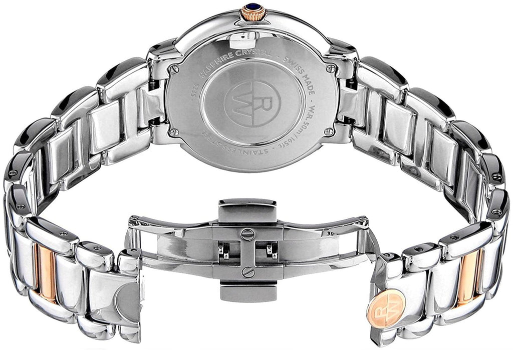 Raymond Weil Jasmine Two Tone Stainless Steel & PVD Rose Gold Plated Womens Luxury Swiss Watch Model# 5235-S5-01659 , 5235S501659.This Raymond Weil Jasmine timepiece features a polished stainless steel & PVD rose gold plated case & bracelet, Silver dial with design in the center, blue hand indicators, black Roman Numeral hour markers, Date display at the 3 o'clock position, Scratch resistant sapphire crystal, rose gold fluted crown set with blue cabochon, Swiss Quartz Movement, Water resistant to 50 meters/165 feet.