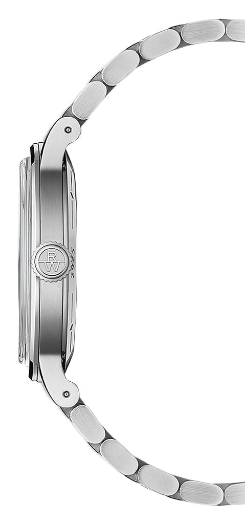 Offering a period charm combined with present-day practicality, Raymond Weil's inaugural Millesime collection pays homage to its rich horological heritage and traditions while celebrating the simplicity of refined design. This gents' vintage-inspired Millesime features a 39.5 mm stainless steel case with a fixed bezel and oversized fluted crown. It holds a dark blue sector dial under a scratch-resistant glassbox sapphire crystal. Contrasting finishes adorn the minimalist dial, such as the snailed minute track and a smooth hour track. It has silver-tone and luminescent tapered sword hands and white indices as hour markers. Its central seconds hand sweeps around the dial's neo-vintage aesthetic, highlighting geometric lines and discrete tracks. It is fitted with a stainless steel bracelet and secured by a folding clasp with a double push-security system. This watch has an exhibition caseback showcasing the caliber RW4200, a Swiss automatic movement beating at 28,800 vibrations per hour, generating up to 41 hours of power reserve and is water-resistant up to 50 meters/165 feet.