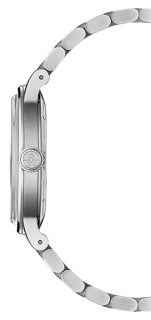 Offering a period charm combined with present-day practicality, Raymond Weil's inaugural Millesime collection pays homage to its rich horological heritage and traditions while celebrating the simplicity of refined design. This ladies' vintage inspired Millesime features a 35 mm stainless steel case with a fixed bezel and oversized fluted crown. It holds a cream sector dial under a scratch-resistant glassbox sapphire crystal. Contrasting finishes adorn the minimalist dial such as the snailed minute track, and a smooth hour track. It has silver-tone and luminescent tapered sword hands and black indices as hour markers. Its central seconds hand sweeps around the dial's neo-vintage aesthetic, highlighting geometric lines and discrete tracks while each of its 4 lugs are adorned with 4 sparkling diamonds for that touch of elegance and femininity. It is fitted with a stainless steel bracelet and secured by a folding clasp with double push-security system. This watch has an exhibition caseback showcasing the caliber RW4200, a Swiss automatic movement beating at 28,800 vibrations per hour, generating up to 41 hours of power reserve and is water-resistant up to 50 meters/165 feet.