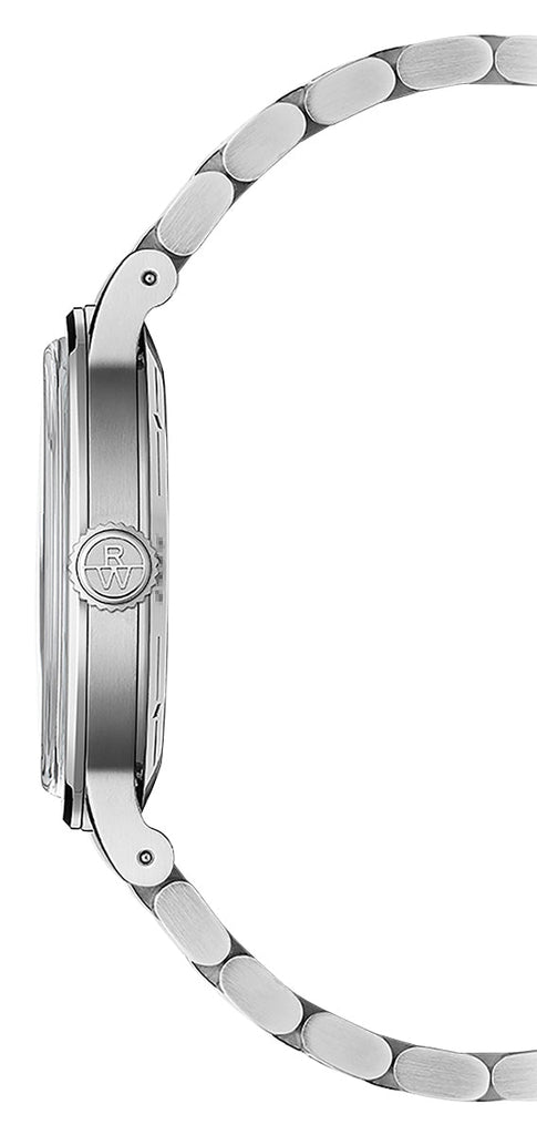 Offering a period charm combined with present-day practicality, Raymond Weil's inaugural Millesime collection pays homage to its rich horological heritage and traditions while celebrating the simplicity of refined design. This unisex vintage inspired Millesime features a 35 mm stainless steel case with a fixed bezel and oversized fluted crown. It holds a sage green sector dial under a scratch-resistant glassbox sapphire crystal. Contrasting finishes adorn the minimalist dial such as the center with a delicate vertical brushing, a snailed minute track, and a smooth hour track. It has silver-tone and luminescent tapered sword hands and white indices as hour markers. Its central seconds hand sweeps around the dial's neo-vintage aesthetic, highlighting geometric lines and discrete tracks. It is fitted with a stainless steel bracelet and secured by a folding clasp with double push-security system. This watch has an exhibition caseback showcasing the caliber RW4200, a Swiss automatic movement beating at 28,800 vibrations per hour, generating up to 41 hours of power reserve and is water-resistant up to 50 meters/165 feet.