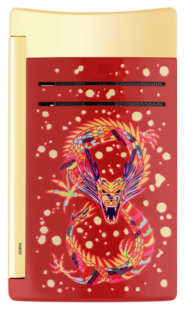 S.T. Dupont Maxijet Dragon Lighter - Yellow Gold Plated Brass & Red/Burgundy Lacquer Model# 020176A fruit of extensive precision and innovation, S.T. Dupont's Maxijet lighters are crafted using fine materials and meticulous work to produce simple accessories with elegant silhouettes and bold designs, transforming them into items of prestige. Also a part of the Dragon collection, this Maxijet Dragon torch lighter features an ergonomic and streamlined case made of chrome-plated brass. The top cap or shutter protecting the nozzle is finished in yellow gold coating as well as the side trigger which is also engraved with the S.T. Dupont logo while the body is distinctly adorned with the psychedelic S.T. Dupont dragon amidst the burgundy lacquered background. Complementing this torch lighter is a fuel level window, butane refill valve, and flame adjuster. It weighs a significant 190 grams, uses Black gas refill ref. 000430 (sold separately), and has overall dimensions of 65.5 x 37.5 x 13.5 mm.