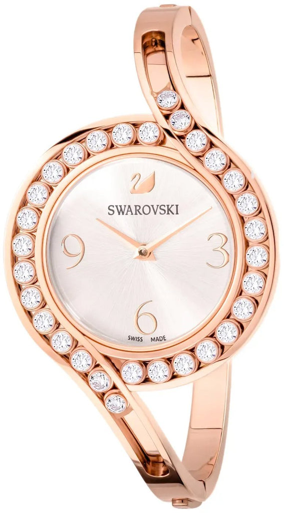 Swarovski Lovely Crystals Bangle Rose Gold Tone PVD Silver Dial Women's Watch Model # 5453648.A stylish and unique interpretation of our bestselling Lovely Crystals watch joins the collection for 2019. Full of modern elegance, the rose gold-tone stainless steel timepiece features 30 Swarovski crystals playfully moving along the case and bangle. A white silver-tone sunray dial adds a glam finish to this beautiful and contemporary watch. Sensual and timeless, it will add playful brilliance to your wrist. Case: 32 mm, water resistant to 50 m, Swiss Made.
