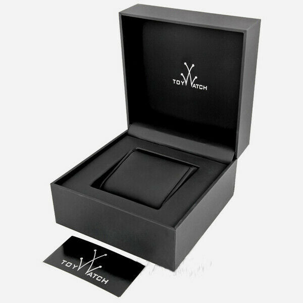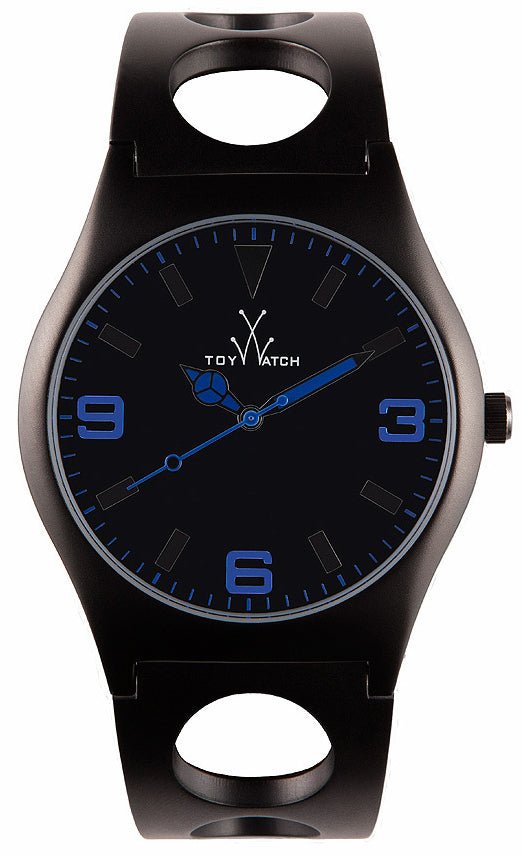 ToyWatch Cuff Black Stainless Steel Mens Bangle watch Model# CU10BK. The ultra-thin watch case is crafted from black stainless steel and is presented on the black bangle bracelet with circular cut-outs, Black dial, blue hand indicators & Arabic Numeral hour markers, Scratch Resistant Mineral Crystal, Quartz movement, Water resistant to 50 meters/165 feet. Two Year Limited Warranty.As all of our watches, this Toy Watch Cuff Mens watch is BRAND NEW, and comes in its original packaging with the warranty card and papers!